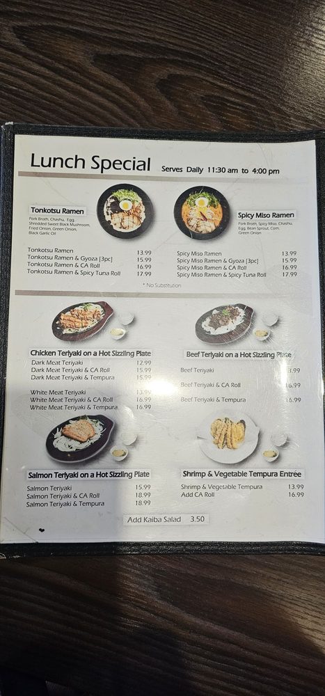 Introducing the menu at Kaiba Japanese Ramen, Sushi & Grill - La Verne, where you can enjoy a variety of dishes in a casual, trendy, and classy setting. From Gyoza and Mixed Tempura for starters to Albacore Carpaccio and Tuna Carpaccio for a unique dining experience, there's something for everyone. Customers praise the fresh and delicious food, with favorites like spicy miso ramen, salmon sushi, and tonkotsu ramen standing out. The restaurant also offers great deals like $1 Saporro on tap and daily lunch specials. With excellent customer service, spacious parking, and a pleasant atmosphere, Kaiba Japanese Ramen, Sushi & Grill - La Verne is a must-visit spot for authentic Japanese cuisine in La Verne.